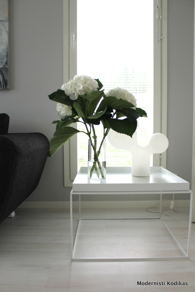 Halusin kotiin valkoisia kukkia. Koska viimeksi ostin liljoja, päätin valita tällä kertaa jotain muuta. Päätös osui hortensioihin, jotka ovat pitkän varren ja suurten kukintonsa ansioita näyttävän näköisiä. Kukat ovat todella kauniit ja niin virheettömät, että ne näyttävät hämäävästi muovikukilta. Luultavasti tämän kirjoitettuani hortensia haluaa osoittaa eloisuutensa pudottamalla kaikki lehdet 😉