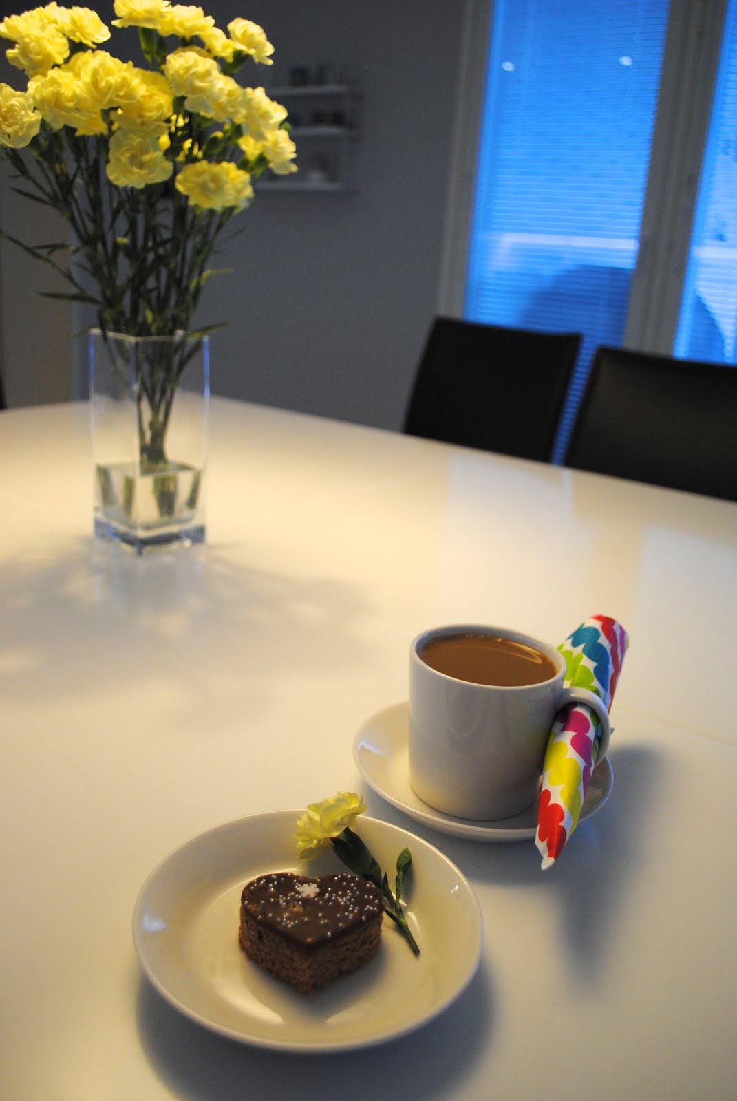 Nyt on laitettu kaikki luovuus peliin keittiössä; ensin leivottu mokkapaloja ja sitten leikattu niistä sydämiä piparkakkumuotilla. Tämä kertoo kaiken leivontataidoistani 😉