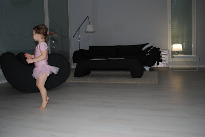 Tytär testaa olohuoneen avaraa tilaa balettisalina muuttopäivän iltana