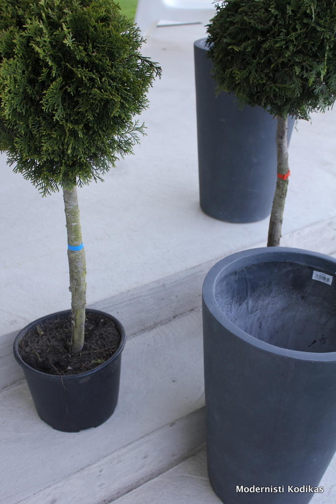 Ruukut ovat jykevät ja tumma hiilenharmaa sopii hyvin betonilla olevaan terassiin. Puutarhuri suositteli laittamaan ruukun sisään styroksia suojaamaan kasvia talven pakkasia vastaan. Hyvin suojattuna tuijan pitäisi olla monivuotinen ilo.