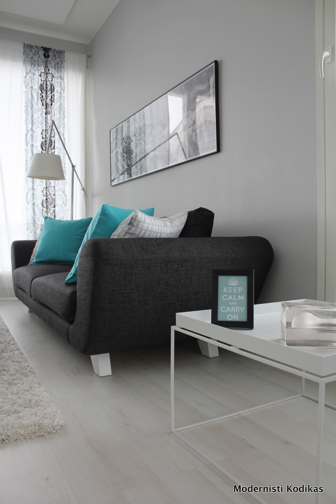 Vaikka harmaa hurmaa minut jokaisena vuodenaikana, olen aika vaihtelunhaluinen ihminen. Tällä kertaa kaivelin kaapista ehkä noin 10 vuotta vanhat Indiskan turkoosit tyynynpäälliset, niiden avulla ja muutaman pienen sisustusidean kanssa olohuone sai uuden pirteämmän ilmeen.