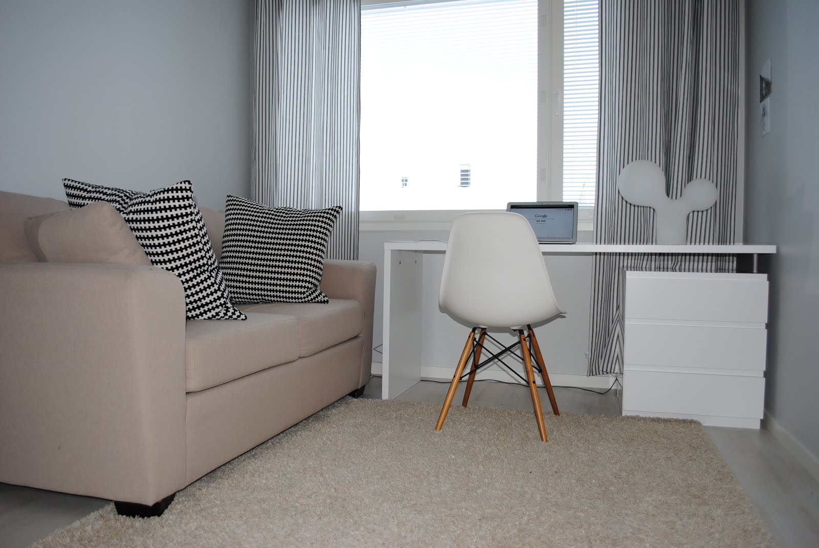 Huoneen verhot ovat harmaabeessit raitaverhot purjerengaskiinnityksellä, jotka tuovat huoneeseen ripauksen raikkautta ja sitoo yhteen modernia Muurametta ja vuodesohvan pehmeää värimaailmaa. Luonnonvalkoinen nukkamatto on niin ikään vanhasta kodistamme. Tauluja tai hyllyjä huoneessa ei vielä ole, mutta jotain seinät kyllä kaipaavat. Kuvat seinällä ovat pikkuveljen grafiikkaa.