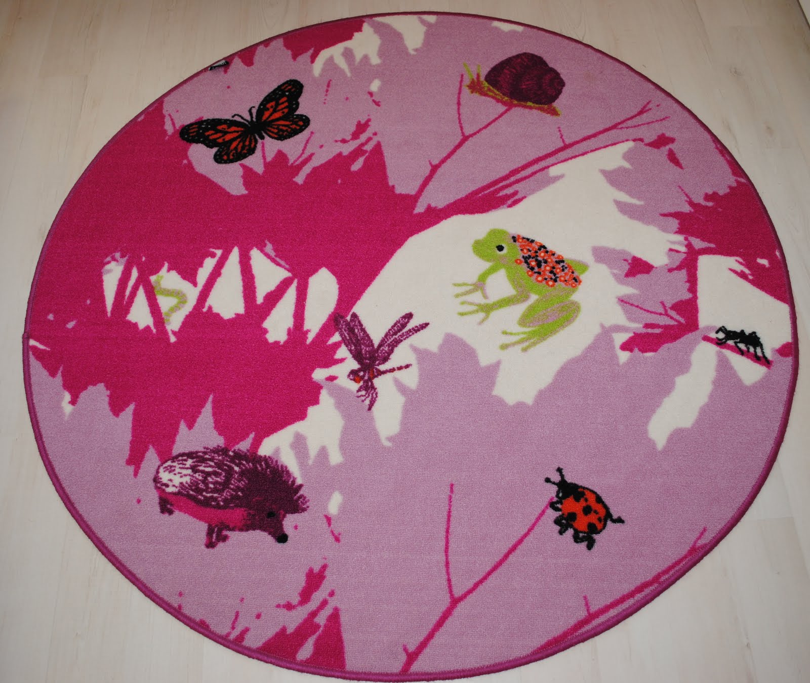 Matto on Vallilan ”Raparperin alla”. Alunperin kaavailin tätä kuosia verhokankaaksi ja seinän pinkki värisävy on poimittu tästä kuosista. Maton pinkki ei yllättäen ollutkaan ihan sama kuin verhokankaan pinkki, mutta menee tämä näinkin. Tyttären mielestä matto on muuten hieno, mutta tuo hämähäkki kuulemma ällöttää häntä 😀
