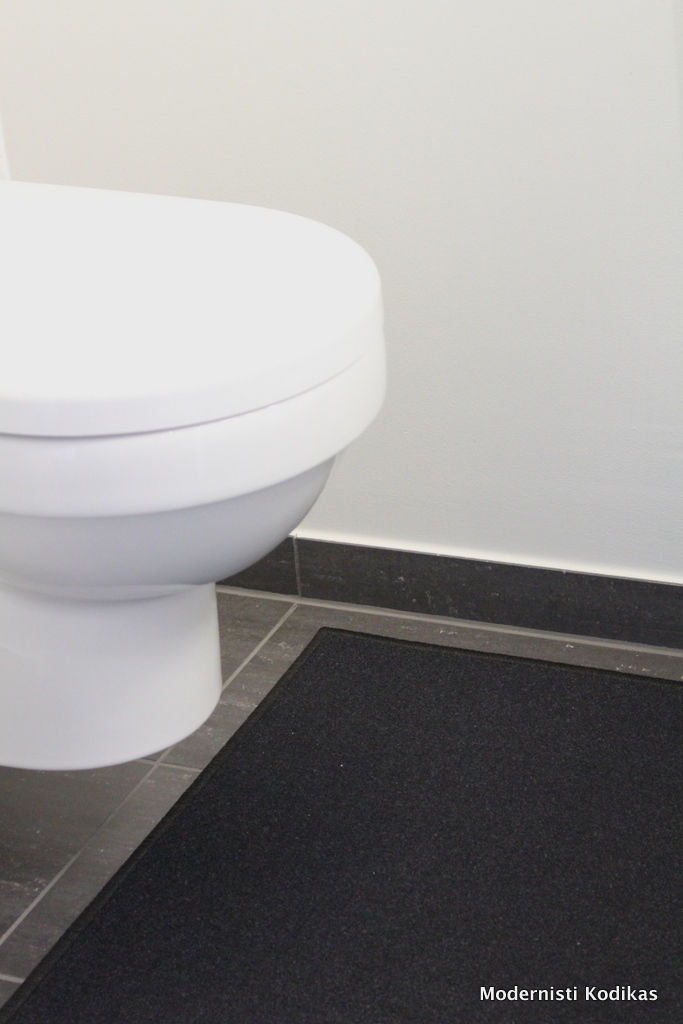 Näyttää hyvältä, mutta joskus mustan vessan maton omistaneena voin kertoa, että on karmean epäkäytännöllinen. Siinä näkyy kaikki pöly, hiukset, pienet paperinpalaset ja muut roskat ja se on jatkuvasti epäsiistin näköinen. Musta-valkoisuus toimii lähes aina, mutta tuosta johtuen vessassa ei. Onneksi ei ollut kallis investointi 🙂
