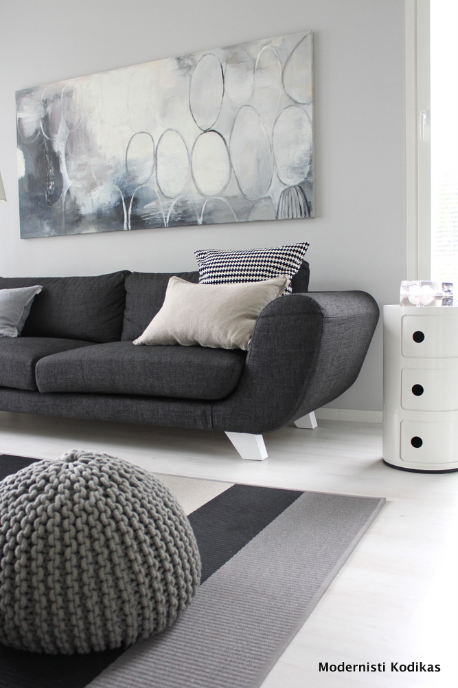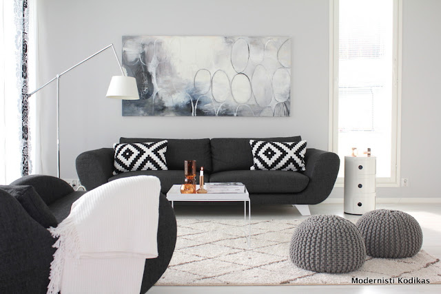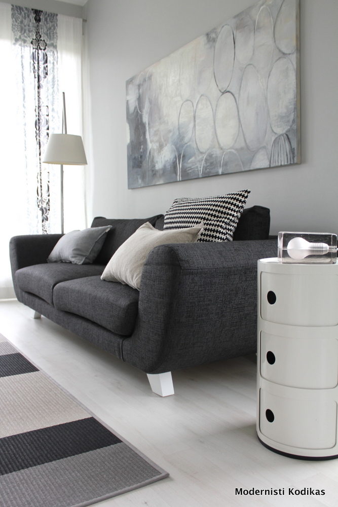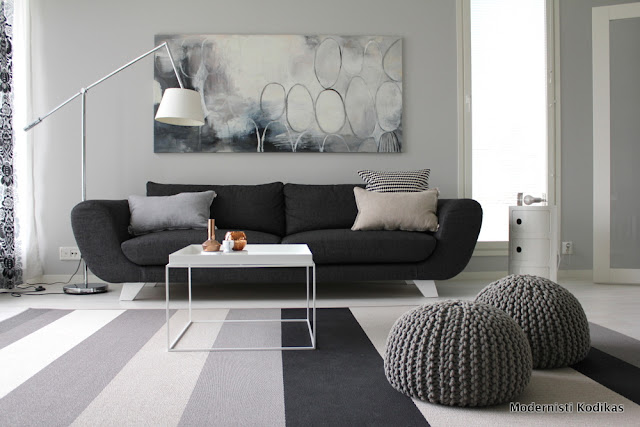 Pidin ehkä enemmän siitä aiemmasta kokonaisuudesta, ruskeaan menevä matto toi vähän kaivattua lämpöä huoneseen. Nyt ehkä aavistuksen julkitilamainen kun on pelkkää harmaata..mutta tyylikästä ja harkittua, joten sopii teidän tyyliin.