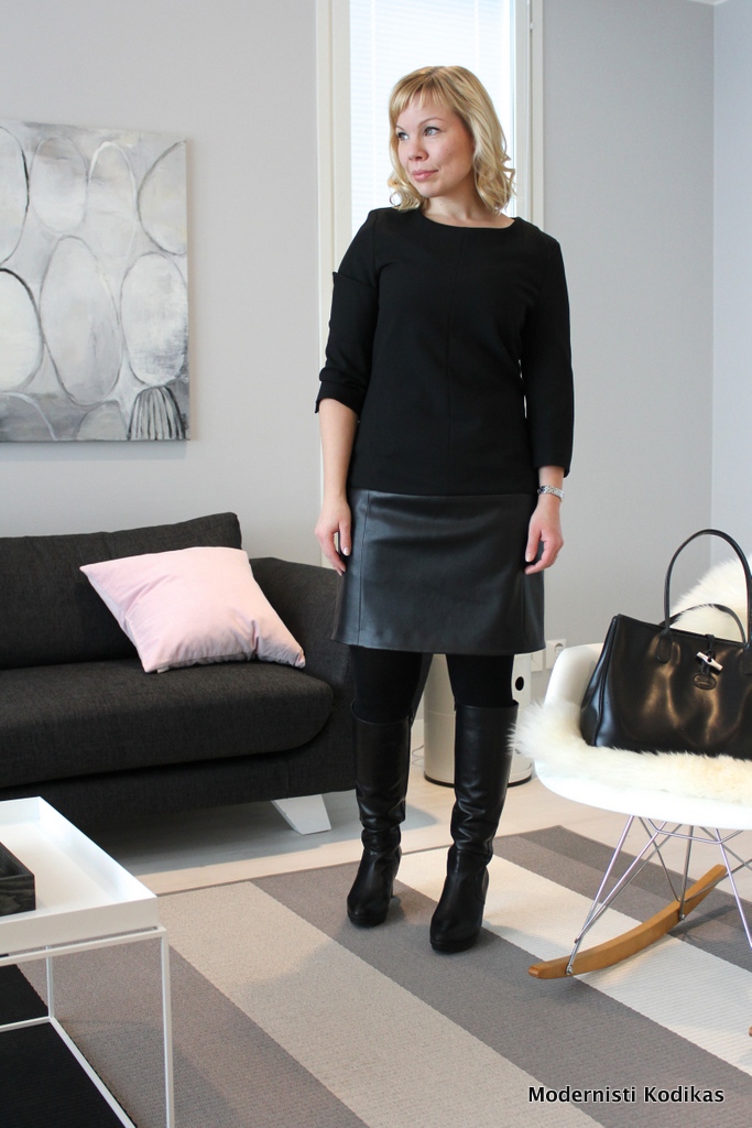Joskus tietää jo sovituskopissa, että vaate tulee lunastamaan paikkansa suosikkien joukossa. Näin kävi viime viikonloppuna, kun kokeilin tätä mustaa Mexx:n mekkoa ensikerran. Leikkaus on äärimmäisen yksinkertainen, mutta ehkä juuri siksi niin toimiva. Vajaamittaiset hinat toimivat ja juju löytyy nahkaisesta helmasta. Hauskalla tavalla syntyy illuusio hameesta ja paidasta. Tähän voi yhdistää juhlavat korkkarit ja lisätä koruja, niin samasta vaatteesta saa varsin helposti iltamenokelpoisen.